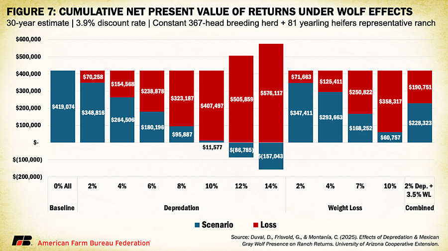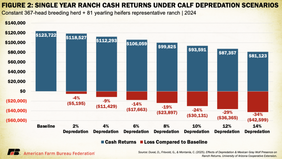 “When a cow is killed, the financial hit extends over multiple years: the operation not only loses that year’s calf, but also future offspring, along with the revenue and herd stability that cow would have provided. Ranchers then have to more frequently retain replacement heifers or buy additional replacements. This means fewer animals are available for sale, working capital must be used to buy additional replacements and herd development is ultimately delayed. ”